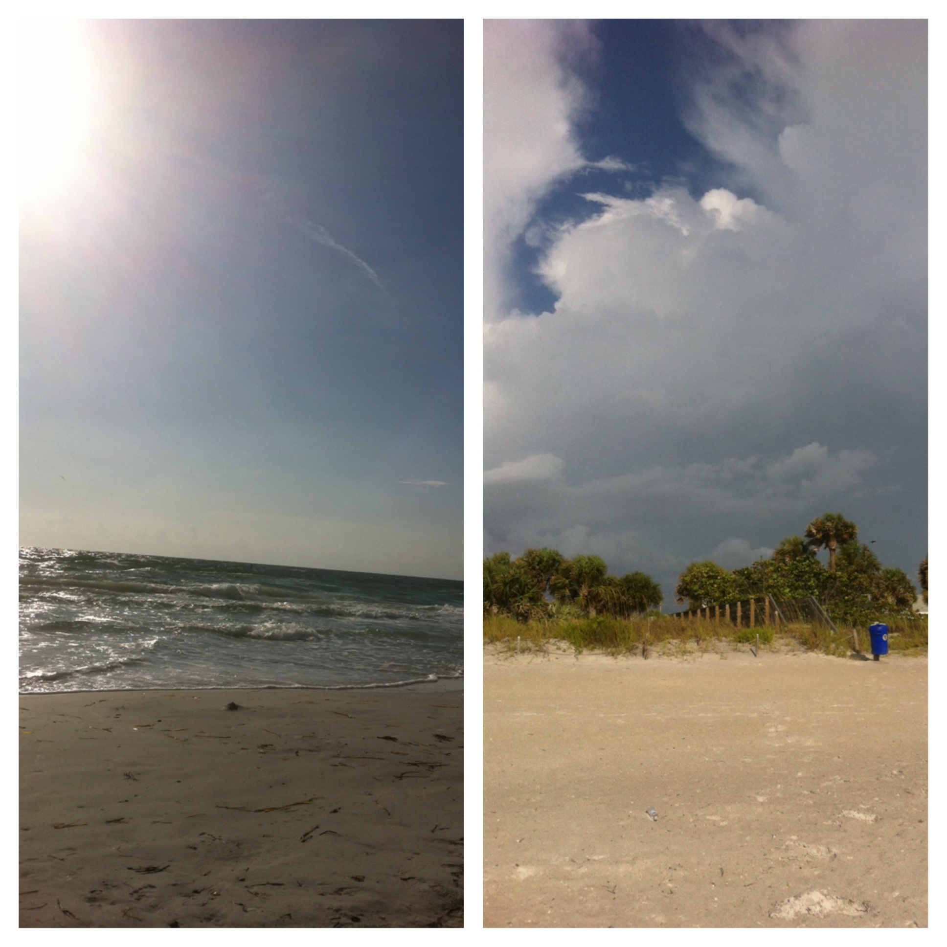 The afternoon was spent reading and reflecting on my trip so far, and then around 4:30, I headed back to the beach for the last Clearwater sunset. As I drove towards the beach, a huge thunderstorm materialized. Instead of turning around, I kept going, knowing that in Florida those kind of afternoon storms often blow over fairly quickly. As I pulled into the beach entrance, it was still raining and thundering a bit, but I could see a line of perfectly clear sky approaching. After about 15 minutes, it was safe enough to walk out onto the beach. The water was fairly rough, and when I walked into the water the waves were extremely strong and knocked me over several times, so I was careful not to venture out too far into the rough water. After that I settled into my little beach chair and was rewarded with a beautiful sunset.