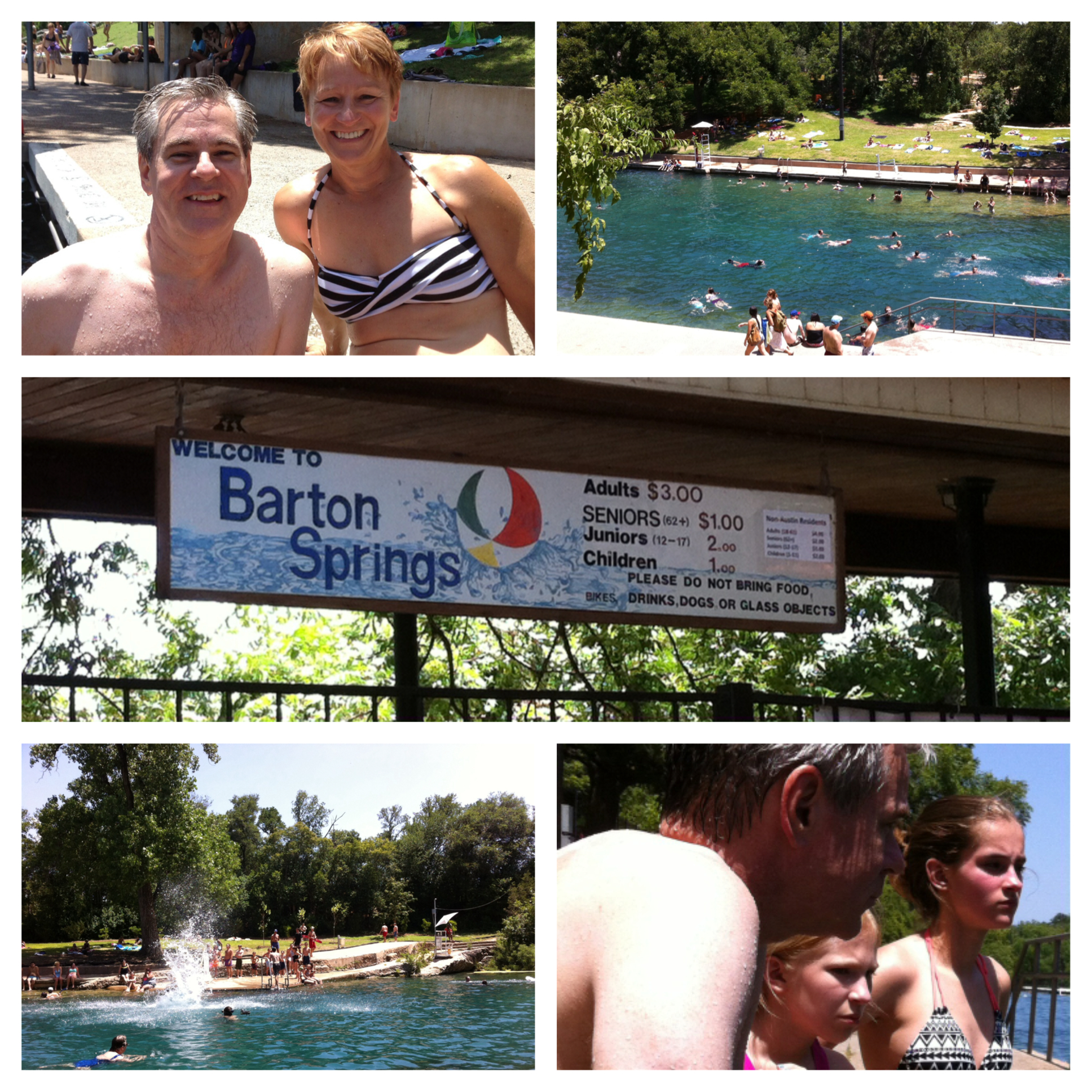The next morning Pat headed off for an appointment as I caught up on blogging and listened to some fantastic horn ensemble pieces that Pat had composed. When he returned, we headed out for our day. We picked up his daughters, 14-year old Sophie and 12-year old Elsa. Not only are they beautiful, smart and sociable, they are also brass players (trumpet and french horn, respectively) Their day had started with chores around the house, and then we piled into the car and headed off for short trip to the orthodontist followed by lunch. After that, I was in for a treat. We were headed to Barton Springs Pool, which the girls warned me was lovely but incredibly cold! Barton Springs Pool is a man made recreational swimming pool in Zilker Park, and maintains a year round temperature of about 70 degrees. We got there and I was thrilled to see that it was almost identical to Centennial Beach in Naperville, where I’d spent most of every summer of my childhood. Pat jumped right in the cold clear water as the girls observed. I gingerly walked down the stone stairs into about waist deep water, and despite the 100 degree heat couldn’t take the cold water and retreated to dry land. Pat continued to enjoy the cold water and I finally challenged myself to take the plunge! It’s the coldest water I’ve ever been in! Sophie never did join us, but Elsa made it in to about chest level!