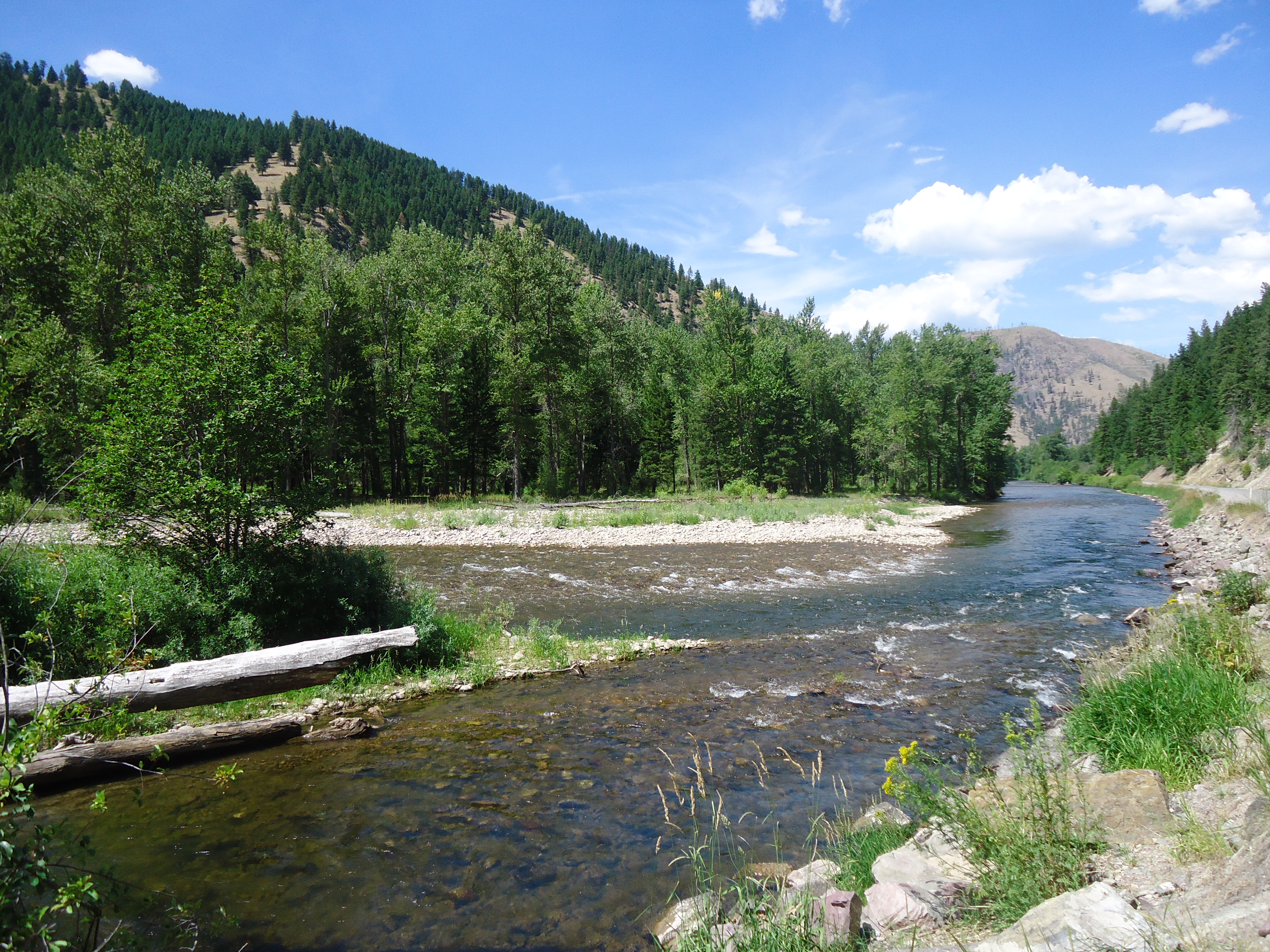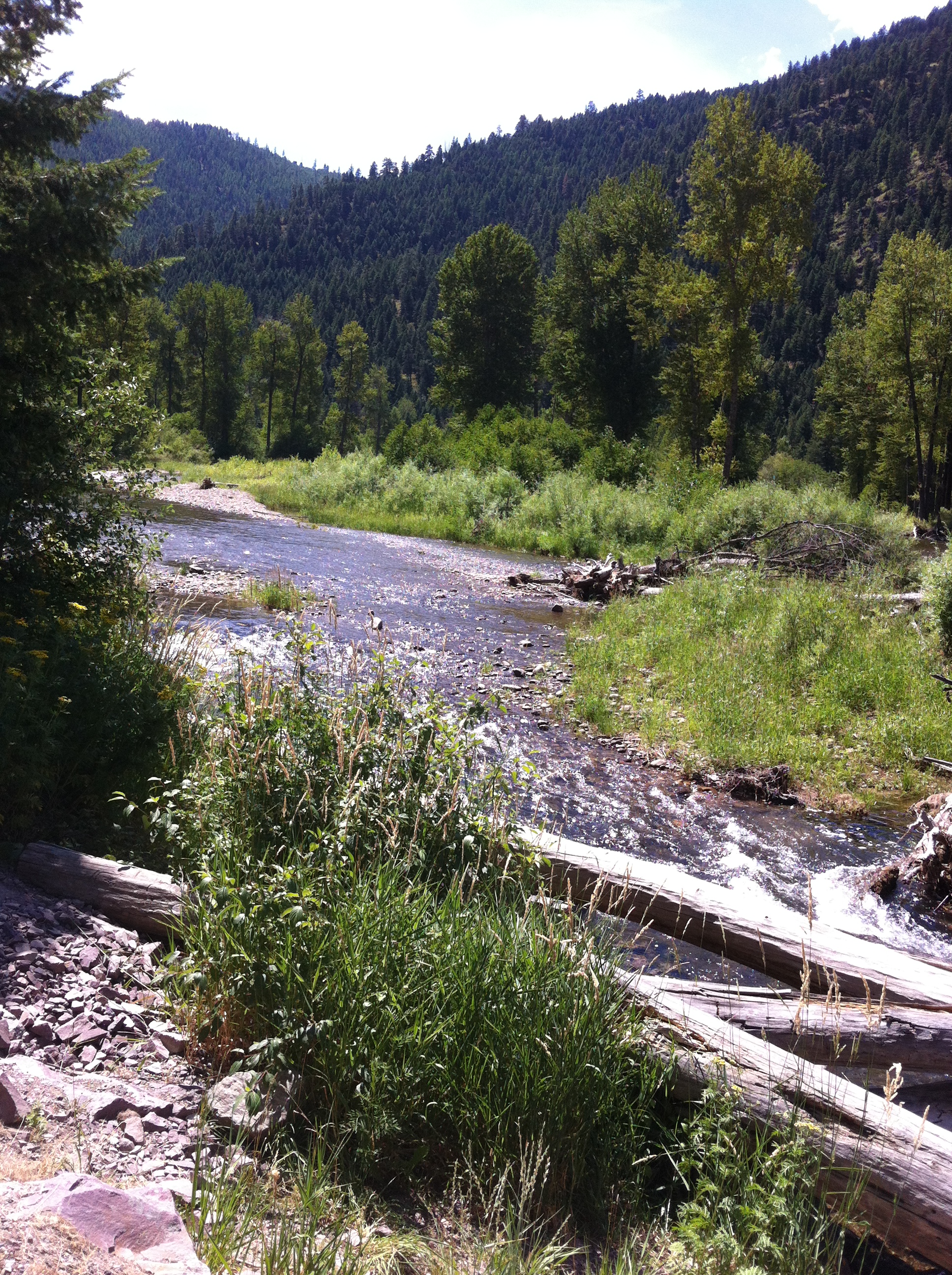 I headed west on Interstate 90 towards Missoula. With a clear blue sky and the sun shining brightly, I finally saw what I’d only imagined in my mind – the immensity of the sky in Montana. It is so immense that I just cannot capture it in the limited frame of a camera. You have to see it to really experience it. After an hour and a half of very flat terrain, the mountains appeared before me again and I kept noticing more winding creeks alongside me. These are fascinating to me, they are so prisitine and isolated and beautiful, and I was determined to find a way to get right next to one. About 20 miles outside of Missoula, I noticed a little exit for a state park. I turned off the interstate and made my way to a tiny little campground/park called Rock Creek Recreation area. I drove down a lonely little road, and there I saw it! The most beautiful little private little creek. I sat there for about a half hour enjoying the solitude.